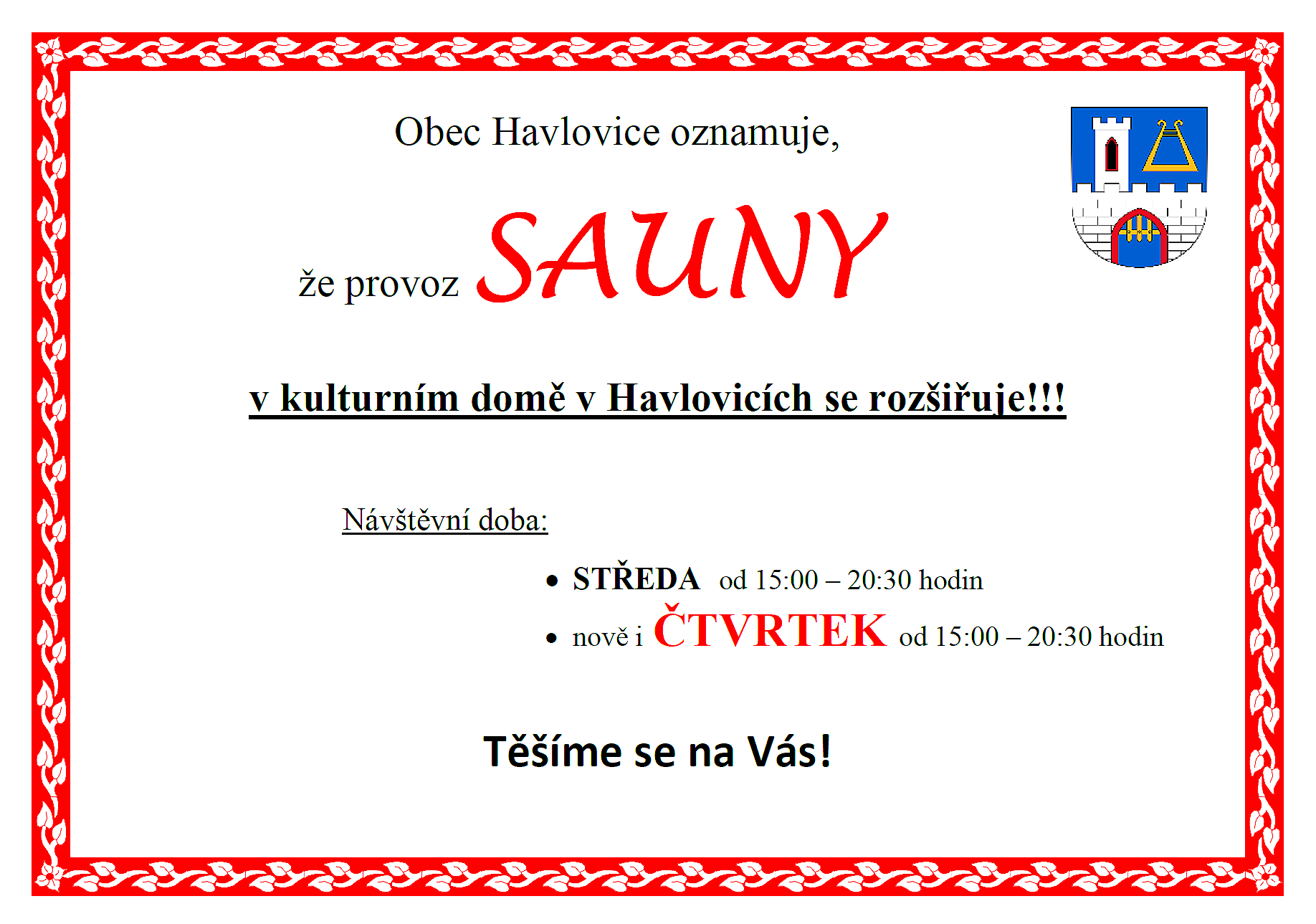 Obec Havlovice oznamuje, že provoz sauny v kulturním domě v Havlovicích se rozšiřuje.
