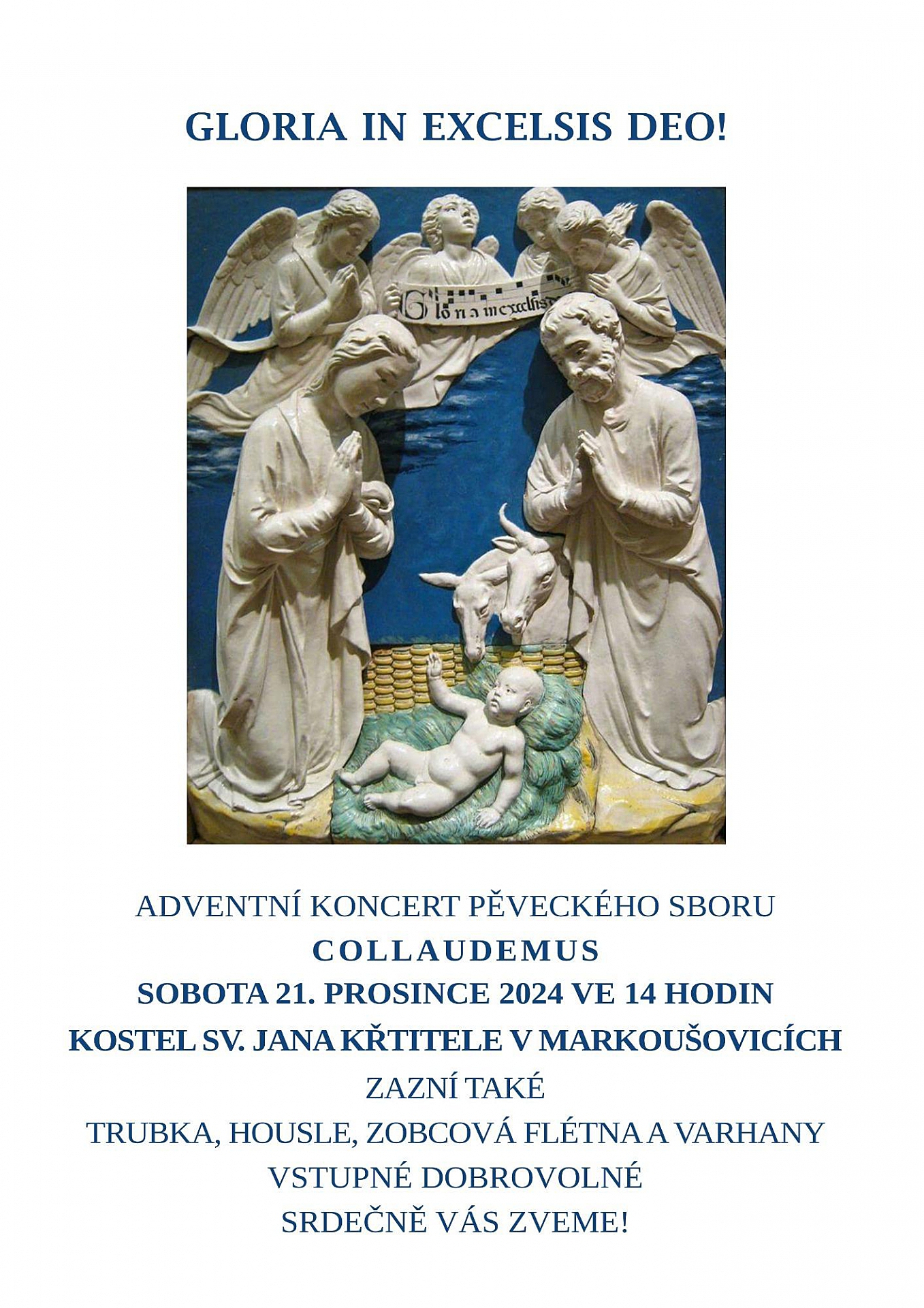 Zveme vás na adventní koncert pěveckého sboru Collaudemus v sobotu 21. 12. 2024 od 14 h. do kostela sv. Jana Křtitele v Markoušovicích.