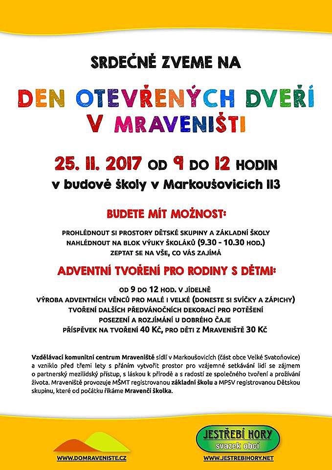 Mraveniště, z.s., Markoušovice, srdečně zve na Den otevřených dveří v Mraveništi, v sobotu 25. 11. 2017 od 9 do 12 hodin v budově školy v Markoušovicích 113. Pro účastníky bude připraveno rovněž adventní tvoření. Informace o dalších akcích v Mraveništi najdete na www.domraveniste.cz.