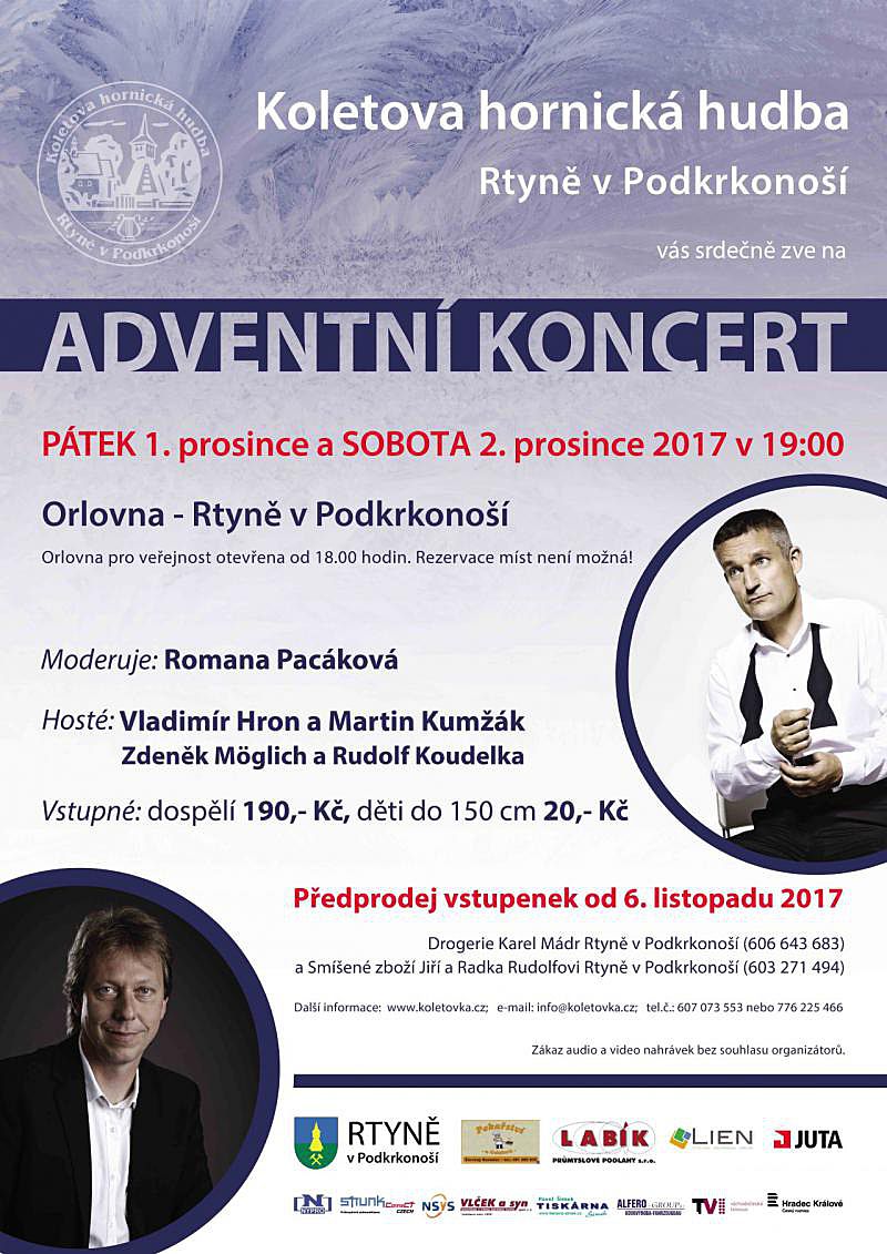 V pátek prvního a v sobotu druhého prosince od 19:00 se konají tradiční Adventní koncerty Koletovy hornické hudby v Orlovně na náměstí Horníků ve Rtyni v Podkrkonoší. Vstupné Kč 150,-, děti do 150 cm Kč 20,-.