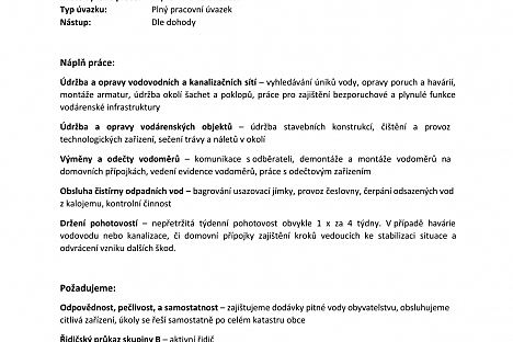 - Opravy poruch, odečty vodoměrů, obsluha ČOV.