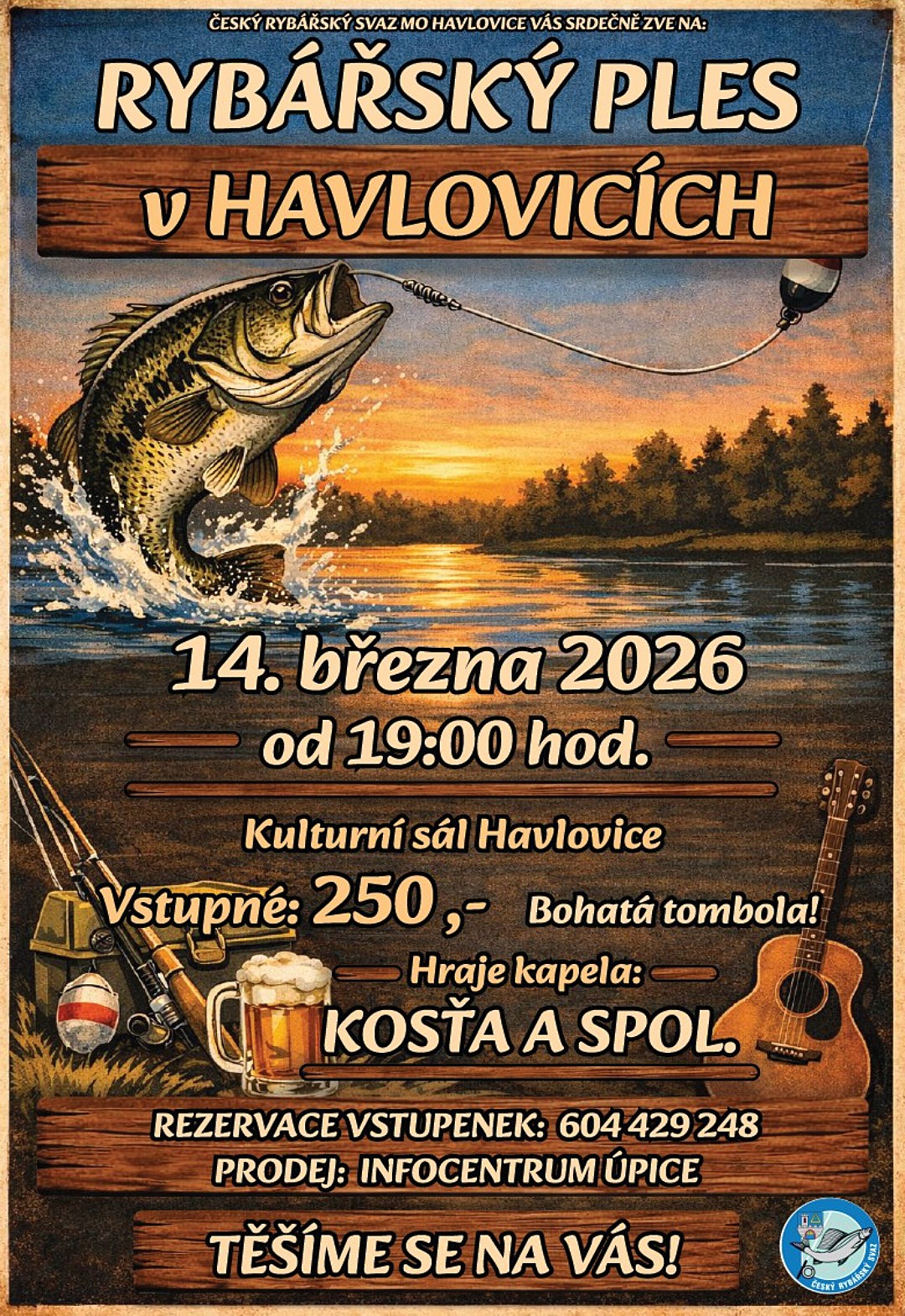 Český rybářský svaz, místní organizace Havlovice, vás srdečně zve na Rybářský ples, který se uskuteční v sobotu 14. března 2026 od 19:00 hodin v kulturním domě v Havlovicích.