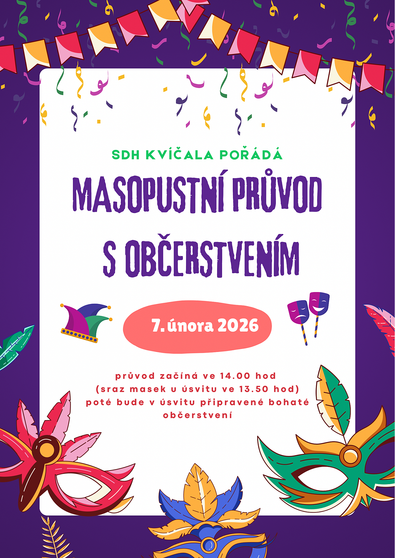 Na tradiční masopustní veselici veškeré maškary a masky zvány jsou.