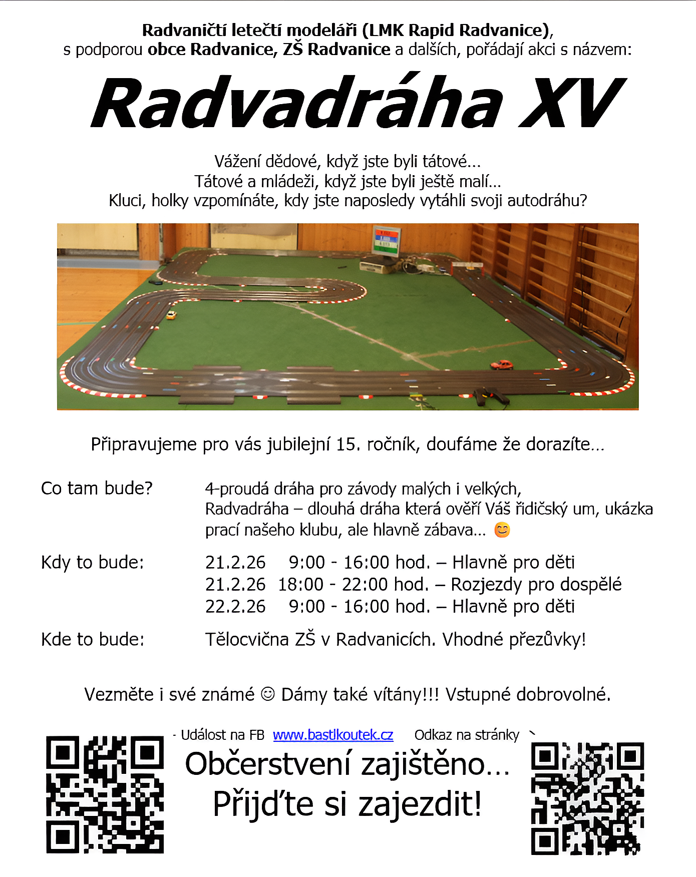 Zveme vás na jubilejní 15. ročník oblíbených závodů, kde se zábava snoubí s adrenalinem! Čeká vás 4-proudá dráha pro závody malých i velkých jezdců a především Radvadráha – dlouhá a technická trať, která opravdu prověří váš řidičský um.