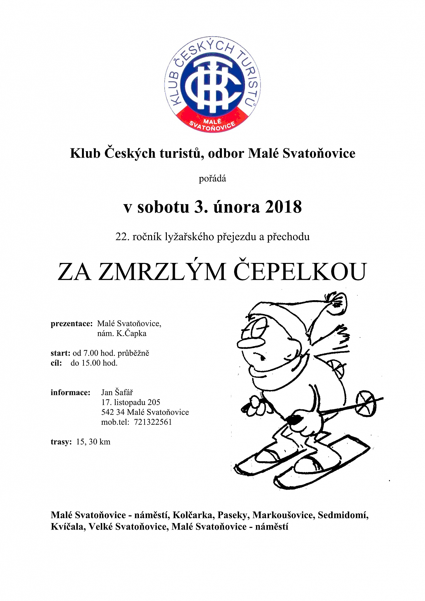 Klub českých turistů Malé Svatoňovice pořádá 22. ročník lyžařského přejezdu a přechodu Za zmrzlým Čepelkou, v sobotu 3. 2. 2018. Více informací najdete na plakátu.