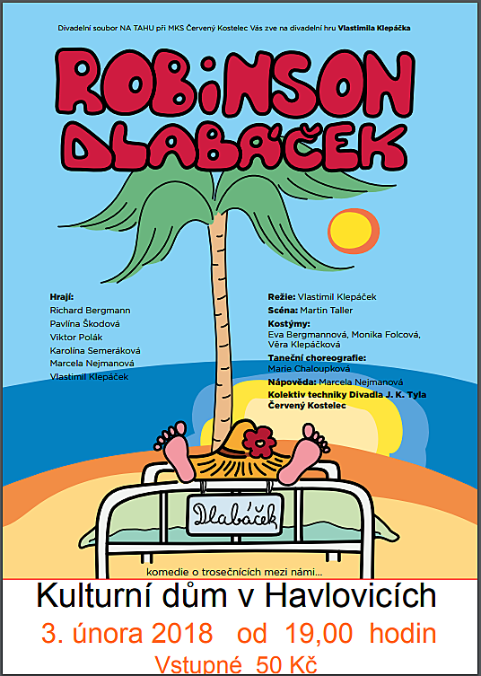 Po roční odmlce opět zavítá do havlovického kulturního domu divadelní soubor z Červeného Kostelce. Tentokrát se představí v sobotu 3. února 2018 od 19,00 hodin s hrou nazvanou Robinson Dlabáček.