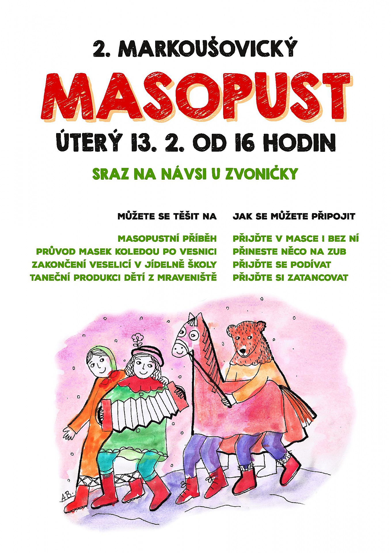 Přijďte s námi oslavit čas mezi Vánoci a Velikonocemi, poslechnout si masopustní příběh, putovat vsí s písničkou, můžete si vybrat či vyrobit masku a zapojit se aktivně či jako divák. Vítán je každý, kdo má chuť... třeba na koblihy :o)