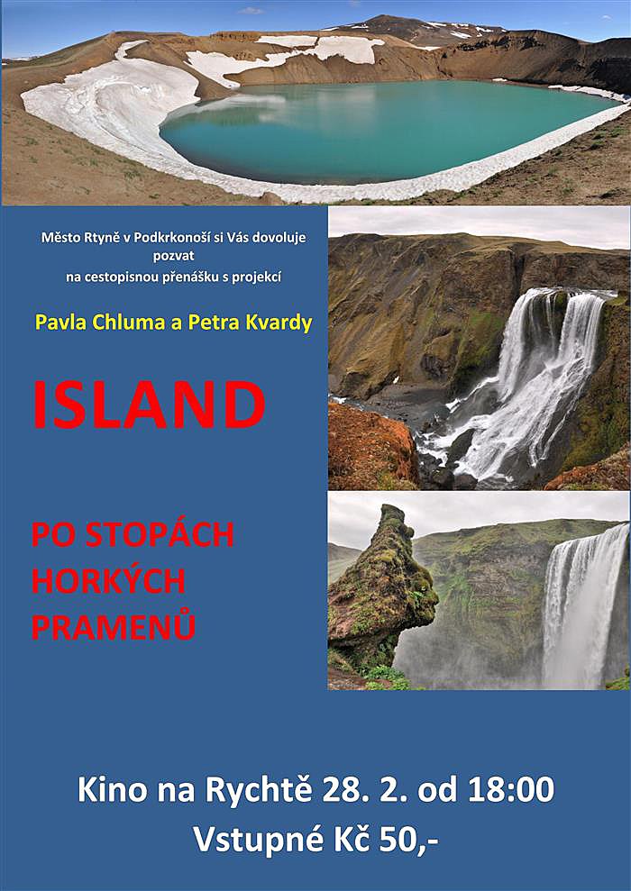 Cestopisná přednáška Pavla Chluma a Petra Kvardy "Island - po stopách horkých pramenů". Kino na Rychtě 28. 2. od 18:00, vstupné Kč 50,-.