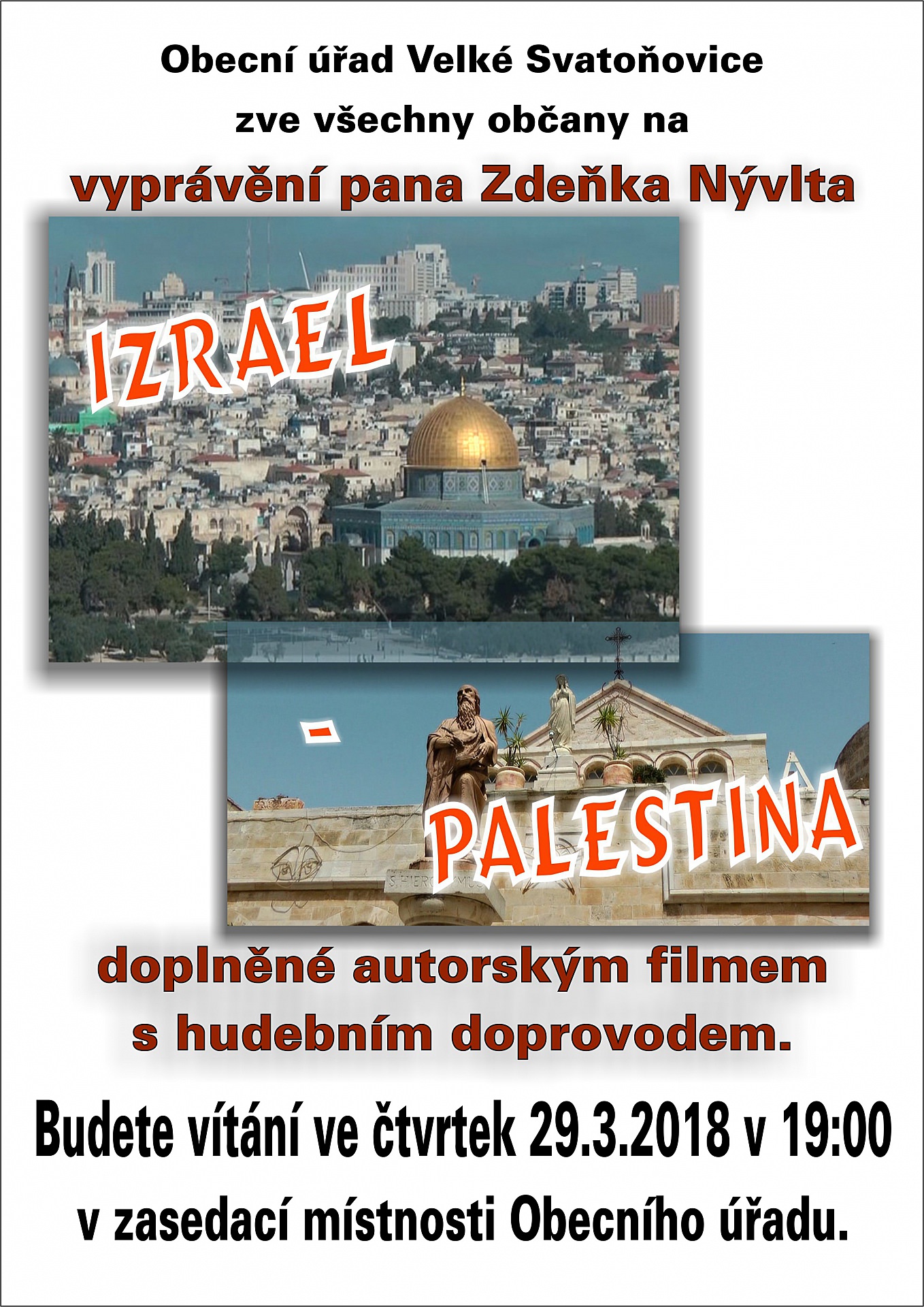 Přijďte si poslechnout 29. 3. 2018 od 19:00 vyprávění Zdeňka Nývlta na téma Izrael a Palestina bude doplněno filmem. Akce proběhne v zasedací místnosti Obecního úřadu. Více informací na plakátu.