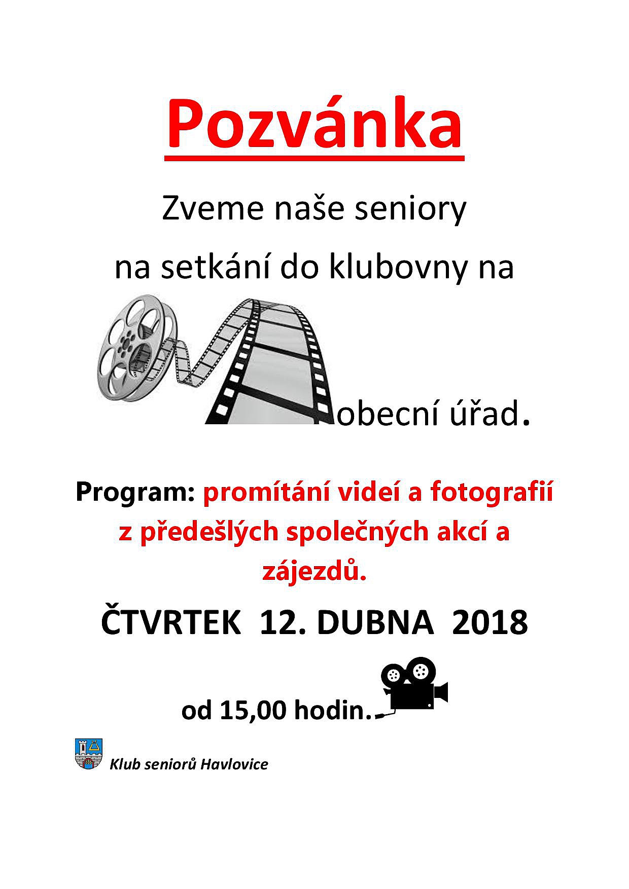 Ve čtvrtek 12. dubna 2018 od 15:00 přijďte do klubovny na obecním úřadě v Havlovicích. Je pro vás připraveno promítání videí a fotografií z předešlých společných akcí a zájezdů. Více informací na plakátu.
