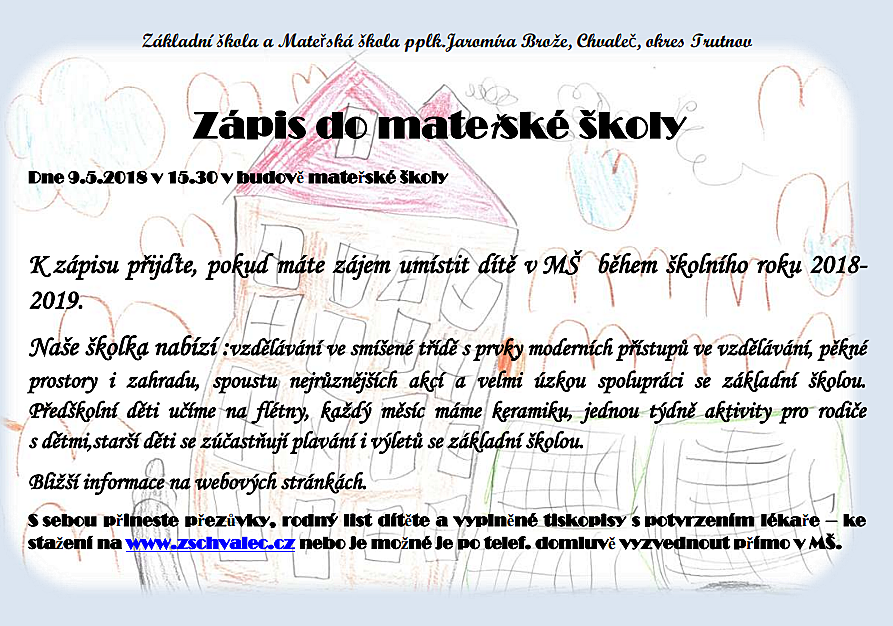K zápisu přijďte, pokud máte zájem umístit dítě v MŠ během školního roku 2018-2019. Více informací o zápise najdete na stránkách www.zschvale.cz nebo na plakátu.