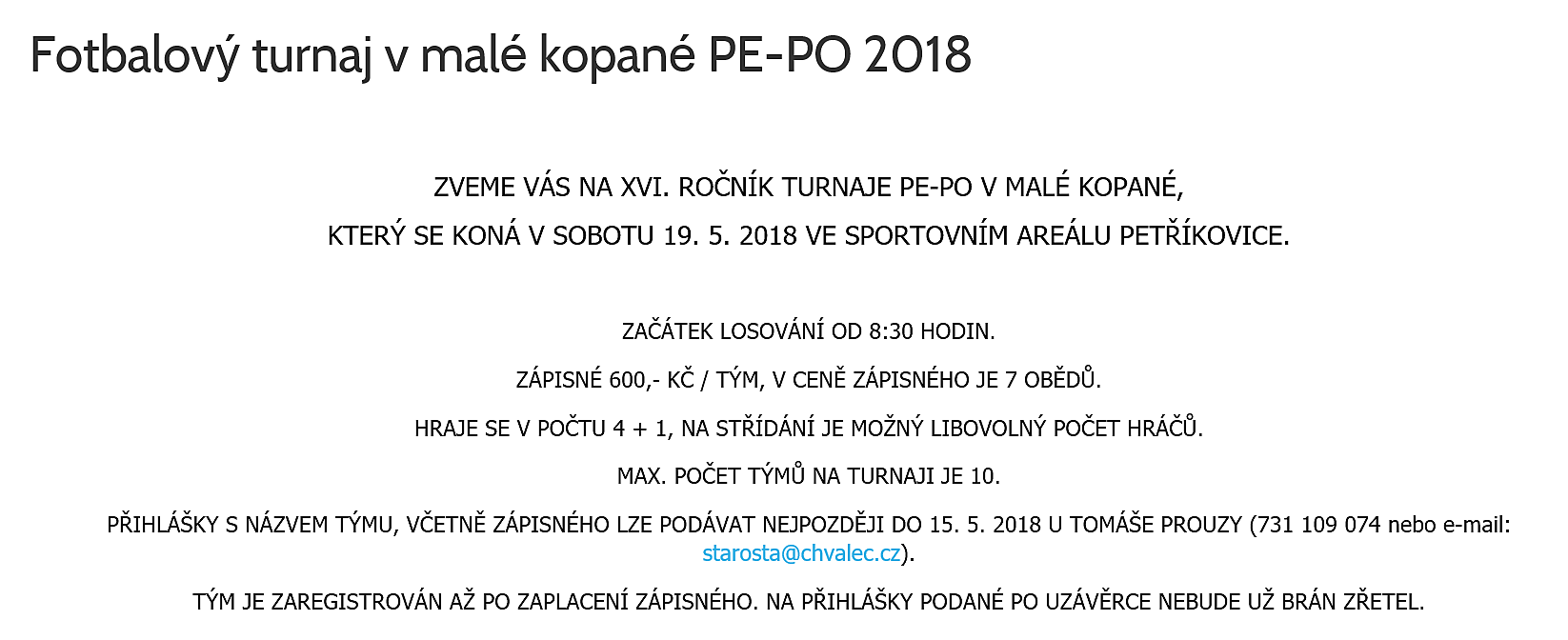 Turnaj se koná v sobotu 19. 5. 2018 ve sportovním areálu Petříkovice ve Chvalči. Více informací na plakátu.