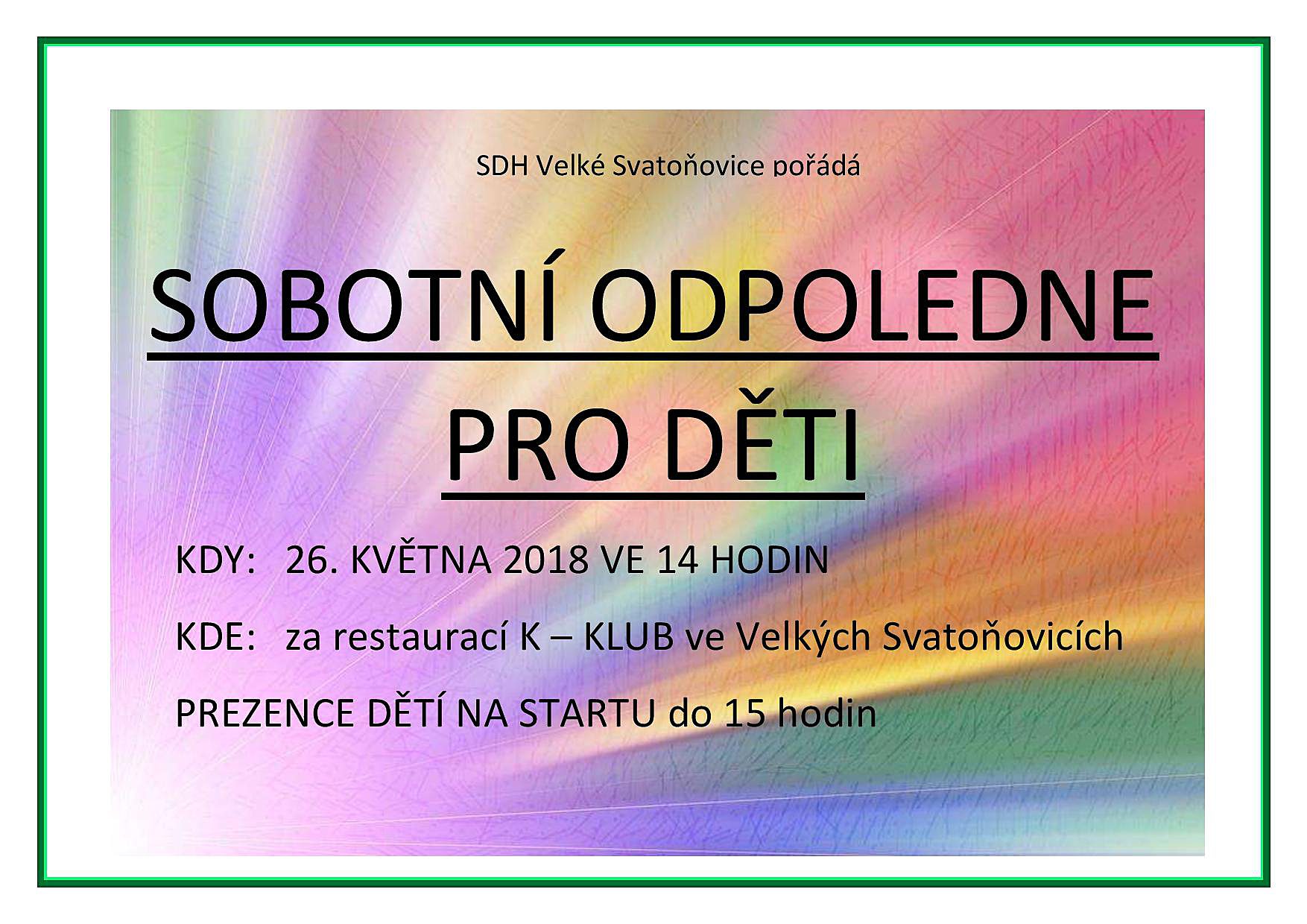 V sobotu 26. května 2018 od 14:00 proběhne za restaurací K - KLUB ve Velkých Svatoňovicích Sobotní odpoledne pro děti. Více informací na plakátu.