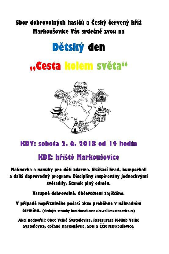 SDH a ČČK Markoušovice Vás srdečně zvou na dětský den na téma "Cesta kolem světa".