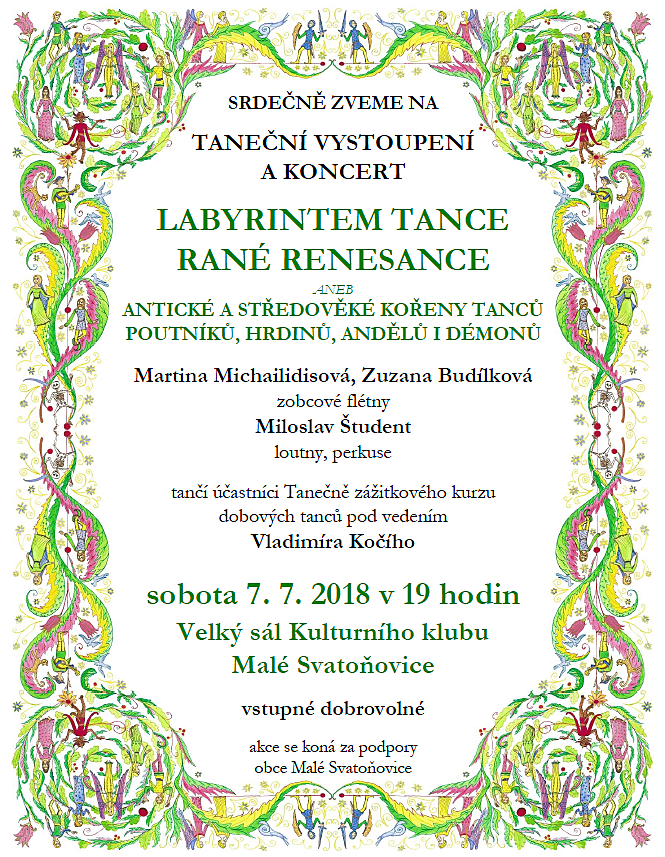V sobotu 7. 7. 2018 od 19:00 ve velkém sále Kulturního klubu v Malých Svatoňovicích proběhne taneční vystoupení a koncert. Vystoupí Martina Michailidisová a Zuzana Budílková se zobcovými flétnami a Miloslav Študent s loutkami. Zatančí účastníci Tanečně zážitkového kurzu dobových tanců pod vedením Vladimíra Kočího. Vstupné je dobrovolné. Více informací je na plakátu.