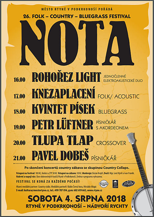 Přijměte pozvání na 26. country-folk-bluegrass festival Nota 2018, který se koná v sobotu 4. srpna 2018 na nádvoří staré Rychty. Po skončení festivalu pokračuje country zábava se skupinou Country Collaps. Moderuje Dušan Krejdl, zvučí Ivan Franěk a Mgr. Leoš Nývlt. Nakrmí a napojí Vás Sbor dobrovolných hasičů Rtyně v Podkrkonoší. Změna programu vyhrazena. Vstupné Kč 100,-, školáci a ZTP Kč 50,-.