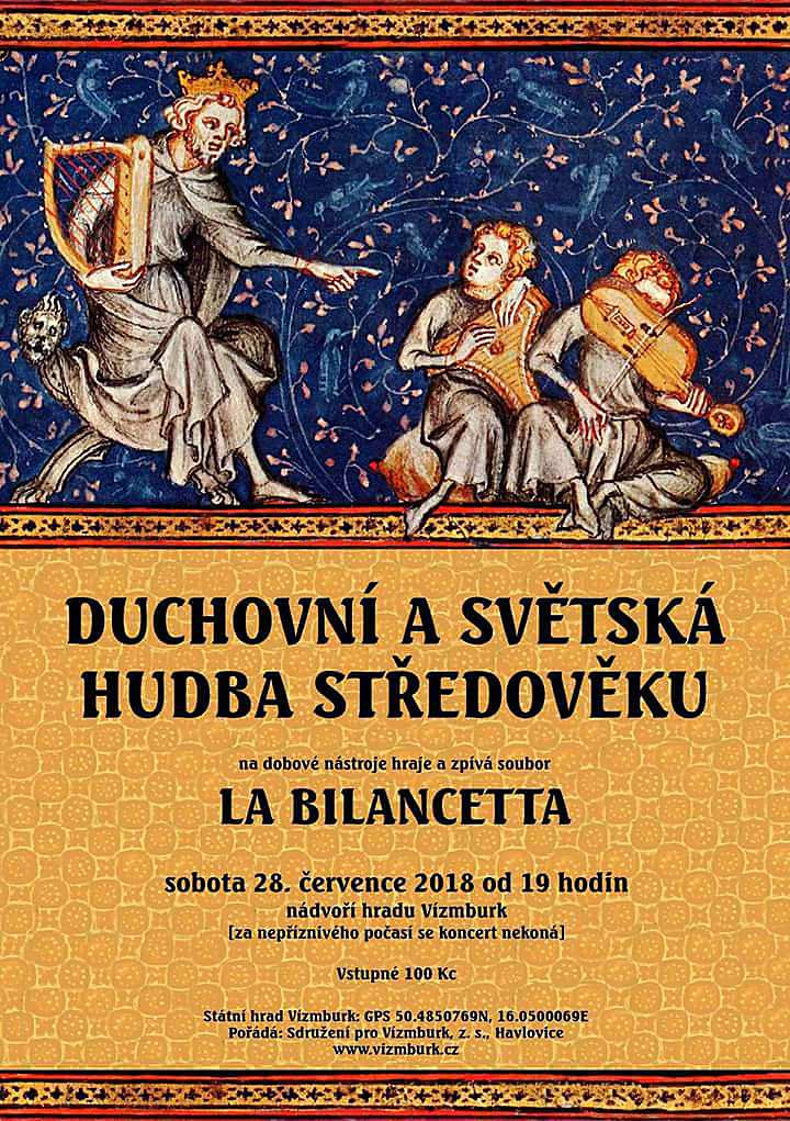 Státní hrad Vízmburk a Sdružení pro Vízmburk, z. s. Vás zve na koncert starodávné hudby, který se koná v sobotu 28. 7. 2018. Soubor La Bialncetta zahraje a zazpívá na Vízmburském nádvoří od 19:00 hodin. Více informací na plakátu a webových stránkách hradu Vízmburk.