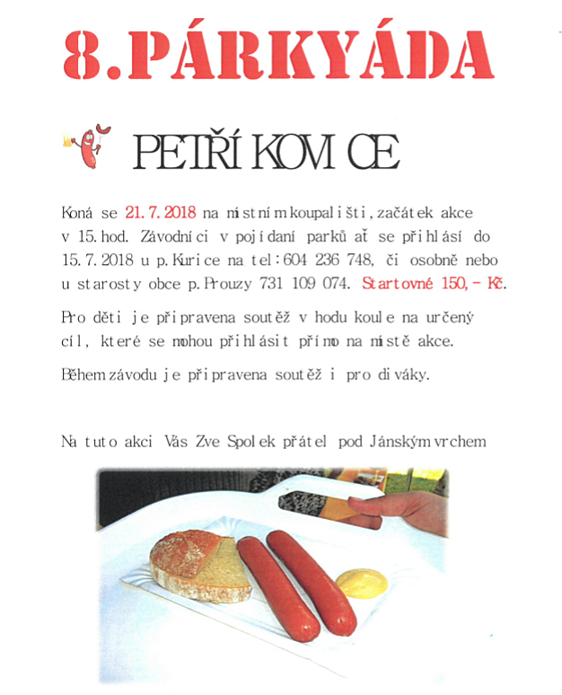 Závodníci v pojídání párků se mohou přihlásit do 15. 7. 2018 u p. Kurice na tel. 604 236 748 či osobně u starosty obce p. Prouzy. Startovné je 150 Kč. Více informací na plakátu.