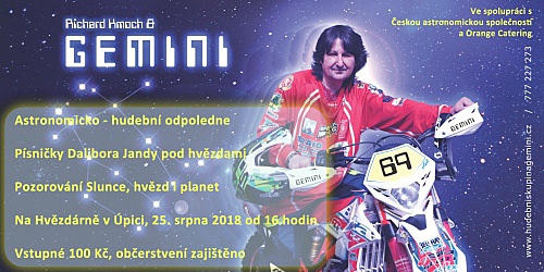 Jste srdečně zváni na atrsonomicko - hudební odpolende v sobotu 25. 8. 2018 od 16:00 hodin na Hvězdárnu v Úpici. K poslechu zahraje Richard Kmoch & Gemini písničky Dalibora Jandy, na programu je pozorování Slunce, hvězd i planet. Vstupné 100 Kč, občerstvení je zajištěno.