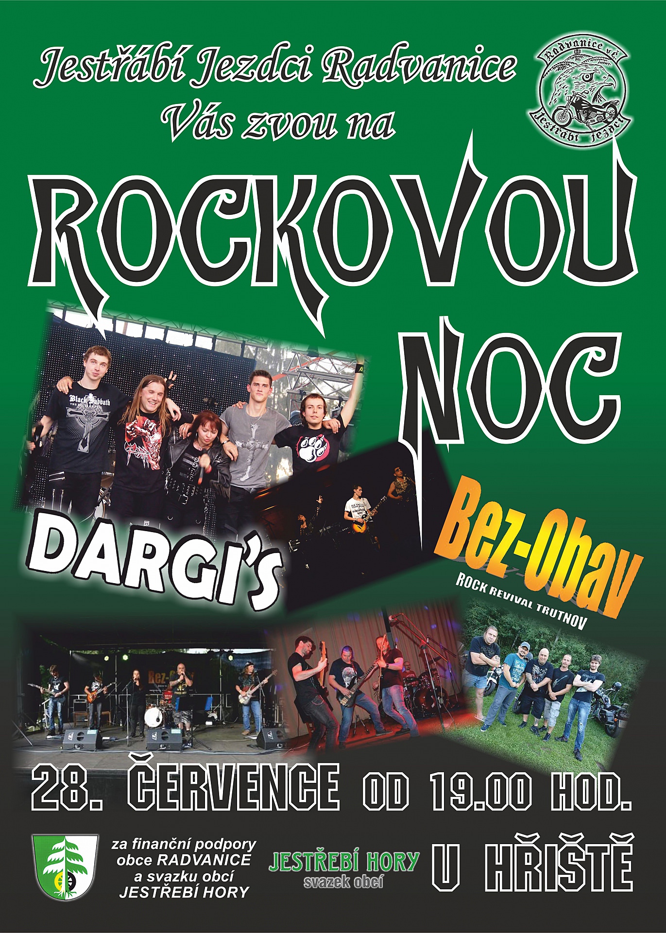 Jestřábí jezdci Radvanice vás zvou na akci "Rocková noc", která se uskuteční v sobotu 28. 7. 2018 od 19:00 hodin u fotbalového hřiště v Radvanicích. Více informací v přiloženém plakátu.