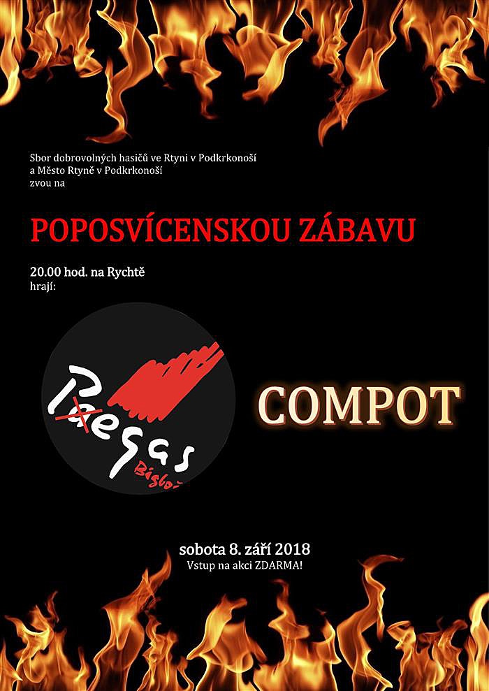 V sobotu 8. září 2018 od 20 hodin vystoupí na Rychtě skupina Pegas a Compot. Vstup zdarma. Více informací na plakátu.