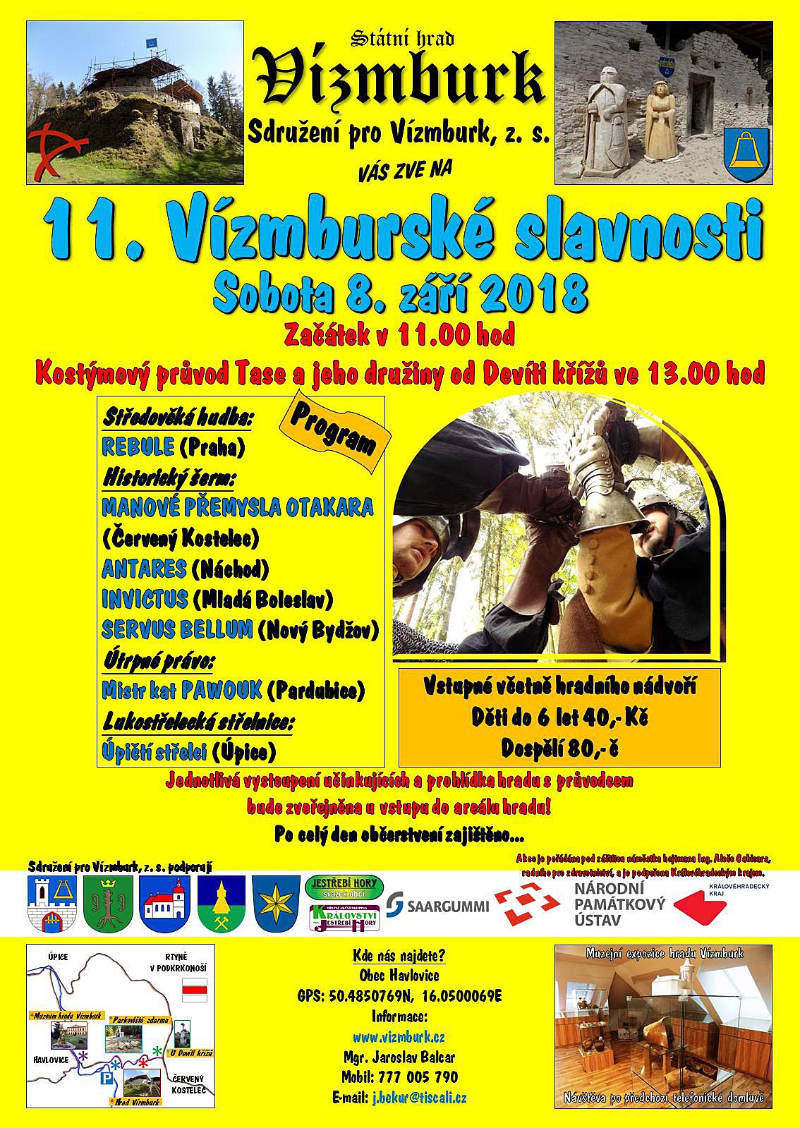 11. Vízmburské slavnosti začínájí v 11:00 hodin. Ve 13:00 hodin se můžete zúčastnit tradičního kostýmového průvodu Tase z Vízmburku a jeho družiny od Devíti křížů. Na hradě je připraven bohatý program a dobré občerstvení. Uslyšíte středověkou hudbu, uvidíte šermíře, mistra kata, můžete si také vyzkoušet lukostřeleckou střelnici a nebo se něco dozvědět o historii hradu od průvodce. Program učinkujících bude upřesněn u vstupu do areálu hradu.