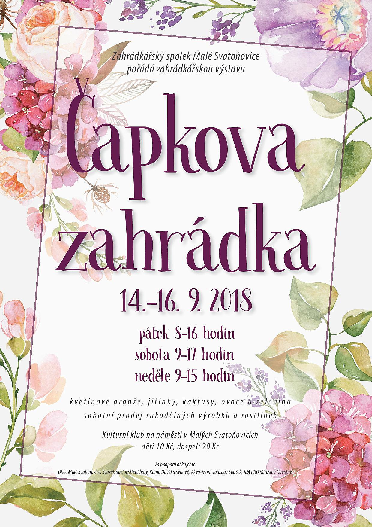 Od pátku 14. 9. 2018 do neděle 16. 9. 2018 bude v kulturním klubu v Malých Svatoňovicích zahrádkářská výstava z názvem Čapkova zahrádka. Je připravena květinová aranže, jiřinky, kaktusy, ovoce a zelenina. V sobotu bude prodej rukodělných výrobků a rostlinek. Více informací na plakátu.