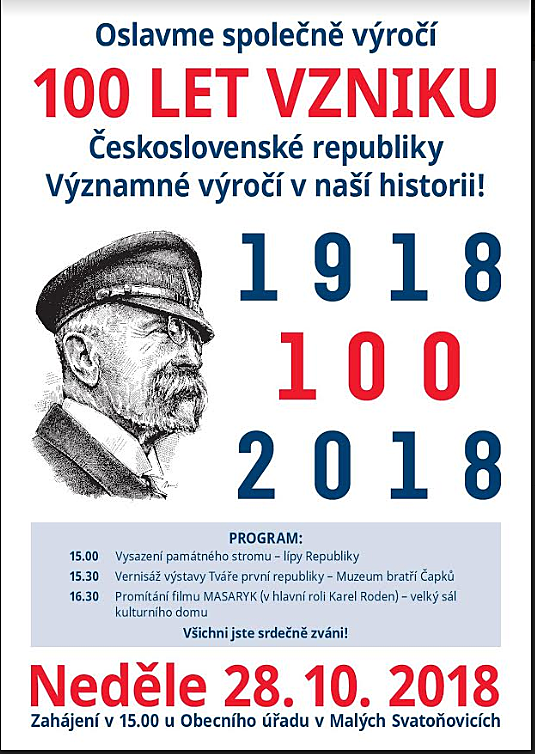 Obec Malé Svatoňovice Vás zve na společné oslavy výročí 100 let vzniku Československé republiky.