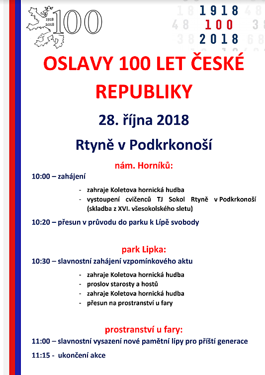 Město Rtyně v Podkrkonoší Vás srdečně zve na oslavy 100. výročí založení republiky. Program se započne na náměstí Horníků v 10:00 hodin tóny Koletovy hornické hudby. Součástí oslav bude vysazení pamětní lípy.