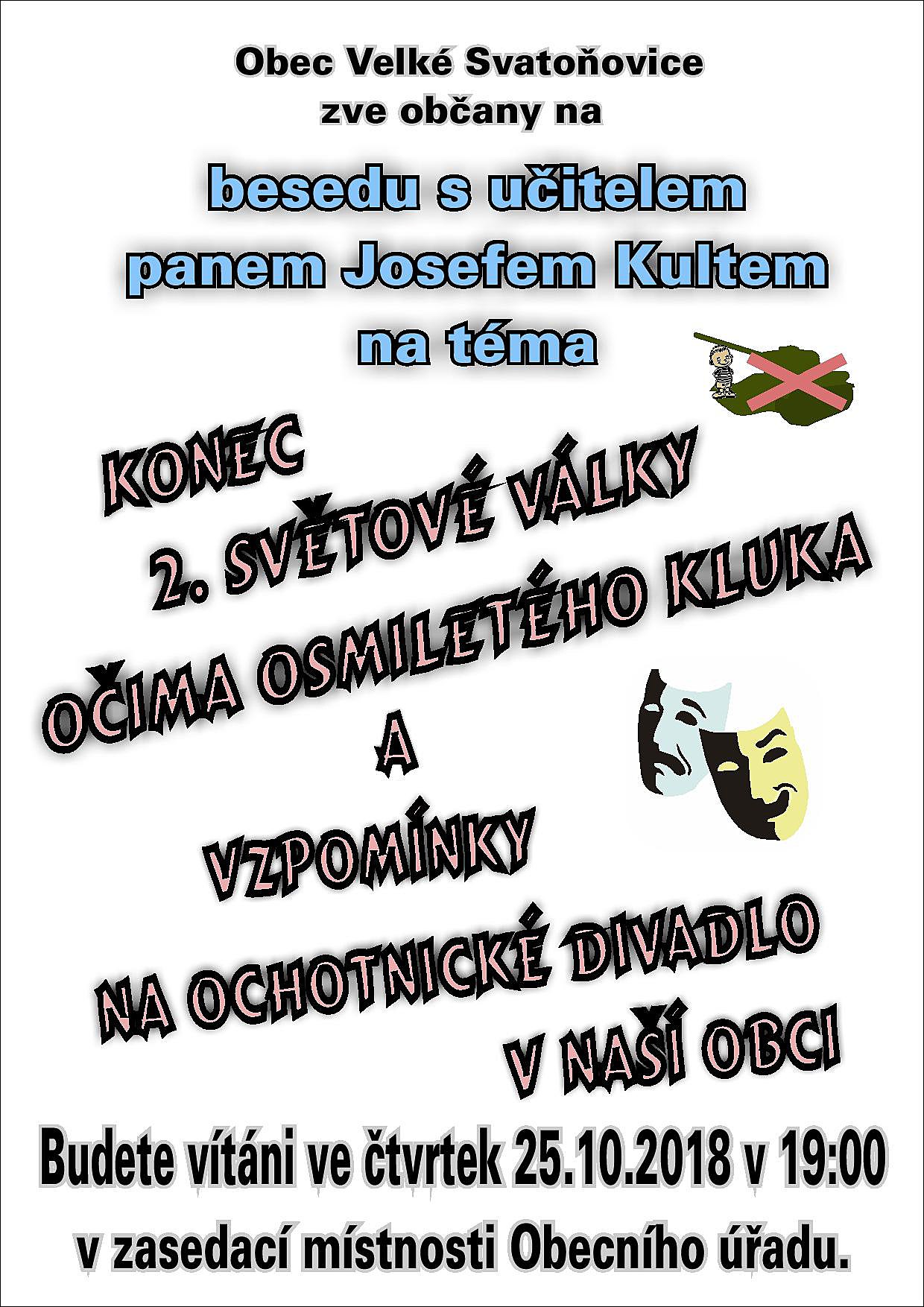 Ve čtvrtek 25. 10. 2018 od 19:00 v zasedací místnosti Obecního úřadu ve Velkých Svatoňovicích se bude konat beseda s učitelem Josefem Kultem. Na téma konec 2. světové války očima osmiletého kluka a vzpomínky na ochotnické divadlo v naší obci. Více informací na plakátu.