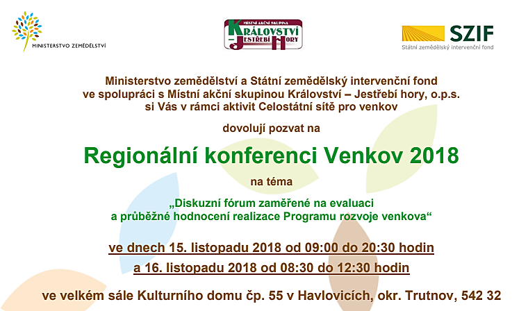 Tradiční podzimní dvoudenní setkání zájemců o dění na venkově pořádá MAS Království – Jestřebí hory, o.p.s. ve spolupráci s Celostátní sítí pro venkov v kulturním domě v Havlovicích ve dnech 15. - 16. 11. 2018.