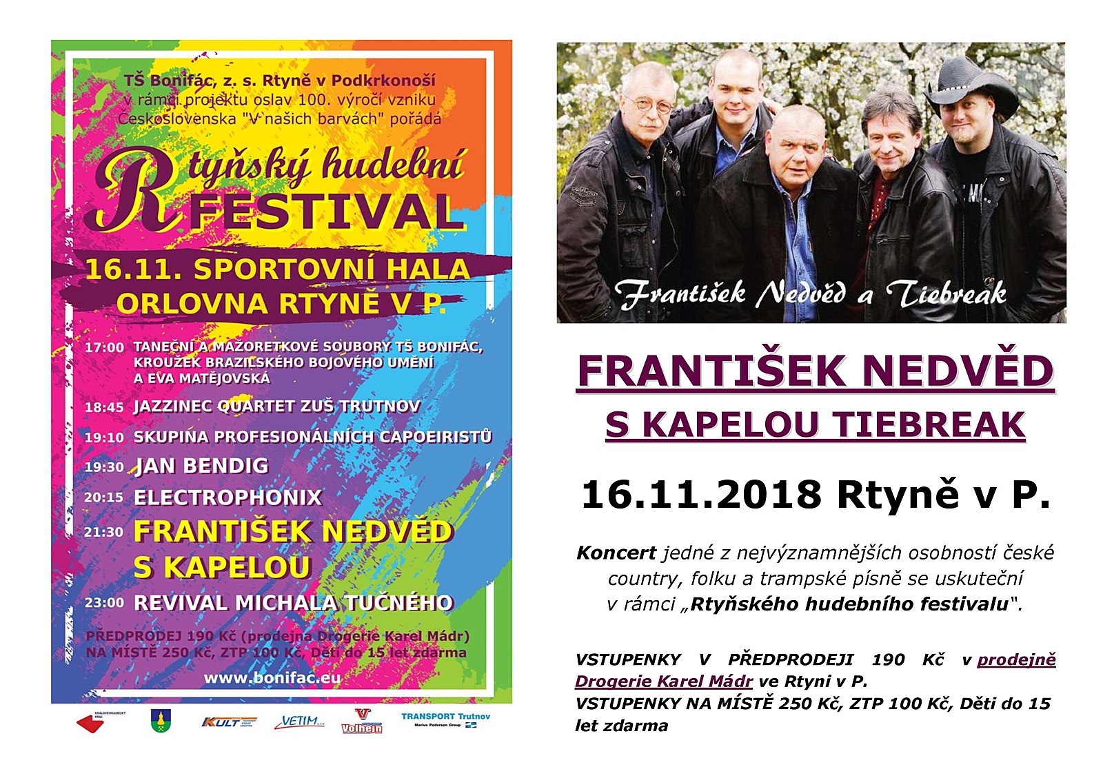 V rámci Rtyňského hudebního festivalu vystoupí v 21:30 František Nedvěd s kapelou Tiebreak. Vstupenky v předprodeji za 190 Kč v prodejně Drogerie Karel Mádr ve Rtyni v Podkrkonoší. Více informací na plakátu.