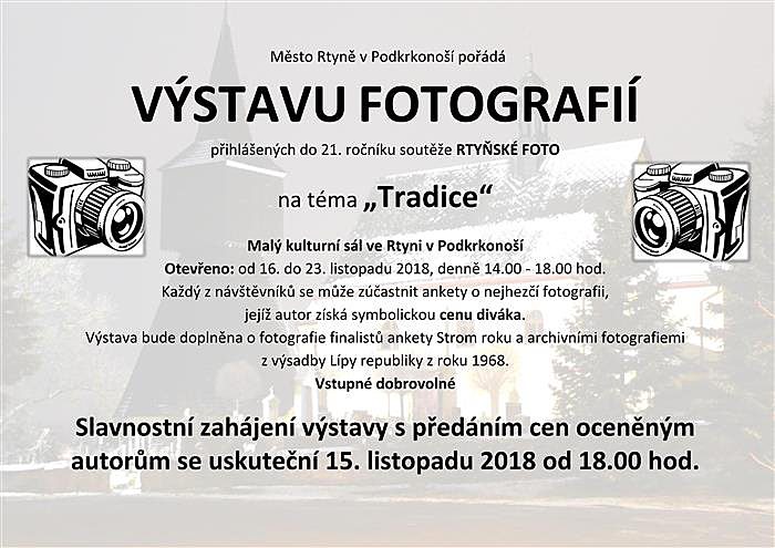 Pozvánka na slavnostní zahájení výstavy fotografií přihlášených do 21. ročníku fotografické soutěže Rtyňské foto 2018, které se uskuteční 15. 11. 2018 od 18:00 hodin v Malém kulturním sále. Výstava bude probíhat od 16. do 23. 11. 2018, vždy od 14:00 do 18:00 hodin. Vstupné dobrovolné.
