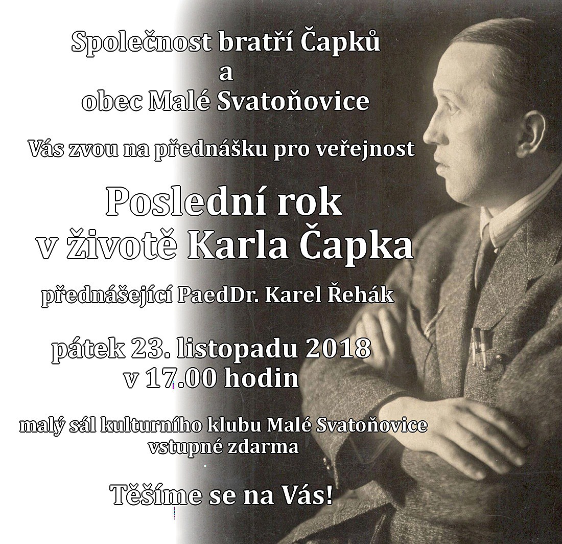 Společnost bratří Čapků a obec Malé Svatoňovice Vás zvou na přednášku pro veřejnost Poslední rok v životě Karla Čapka. Přednášející PaedDr. Karel Řehák. Pátek 23. 11. 2018 v 17:00 hodin, malý sál kulturního klubu v Malých Svatoňovicích. Vstupné zdarma.