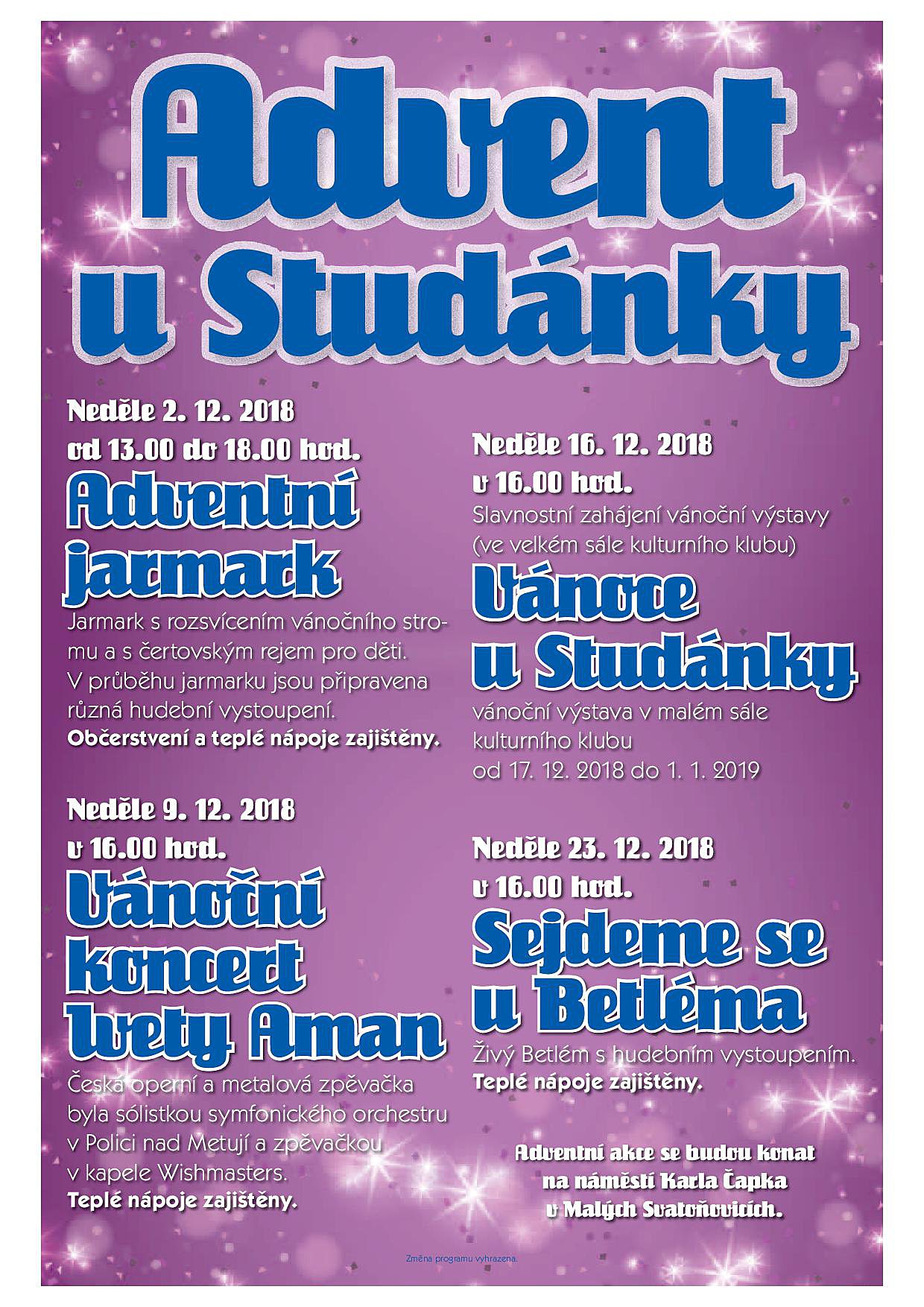Zveme Vás na adventní akce v Malých Svatoňovicích ADVENT U STUDÁNKY. Adventní akce se budou konat na náměstí K. Čapka v Malých Svatoňovicích.