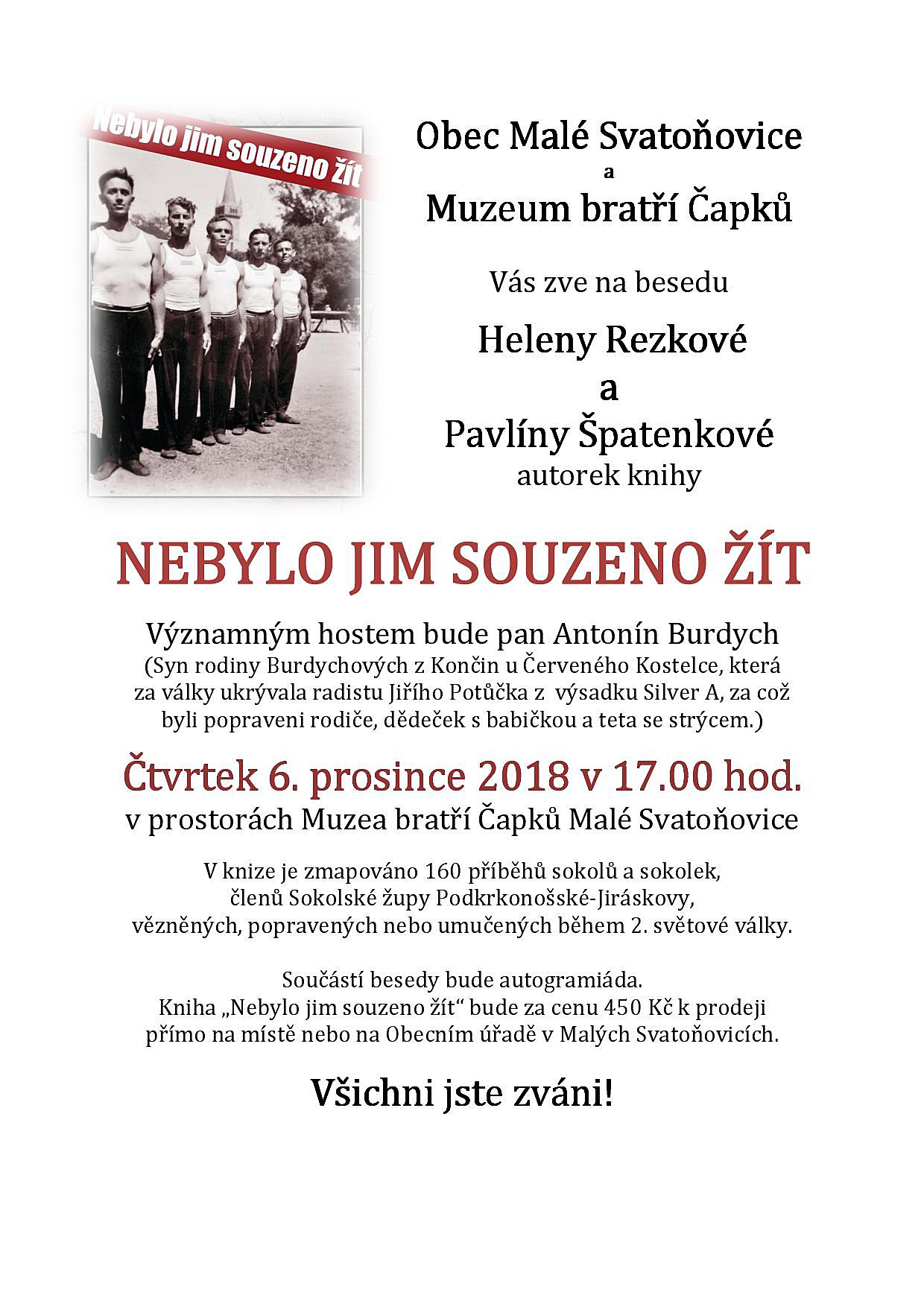 Obec Malé Svatoňovice a Muzeum bratří Čapků Vás zve na besedu Heleny Rezkové a Pavlíny Špatenkové, autorek knihy Nebylo jim souzeno žít. Čtvrtek 6. 12. 2018 v 17:00 hodin v prostorách Muzea bratří Čapků Malé Svatoňovice.