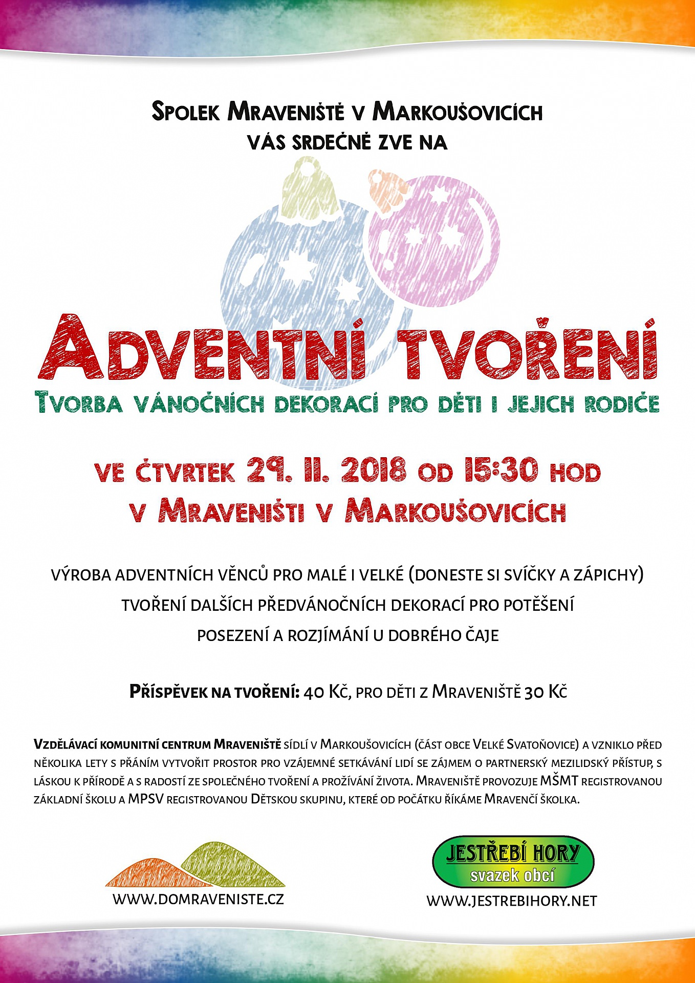 Ve čtvrtek 29. listopadu 2018 od 15:30 v Mraveništi v Markoušovicích se koná adventní tvoření. Je připraveno tvoření vánočních dekorací pro děti i jejich rodiče například výroba adventních věnců. Více informací na plakátu.