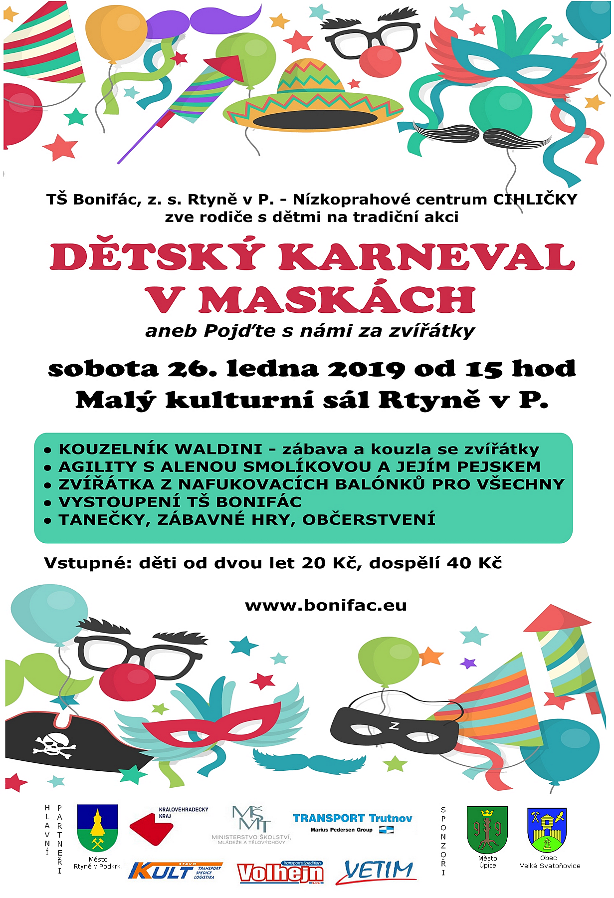 Taneční škola Bonifác – Nízkoprahové centrum Cihličky zve děti na tradiční akci DĚTSKÝ KARNEVAL V MASKÁCH v sobotu 26. ledna 2019 od 15 hodin v Malém kulturním sále ve Rtyni v P.