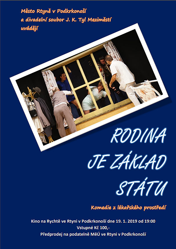 Město Rtyně v Podkrkonoší ve spolupráci s divadelním spolkem J. K. Tyl Meziměstí si Vás dovoluje pozvat na komediální hru z lékařského prostředí "Rodina je základ státu". Kino na Rychtě v sobotu 19. 1. 2019 od 19:00hodin. Vstupenky v ceně Kč 100,- jsou v předprodeji na podatelně MěÚ ve Rtyni v Podkrkonoší.