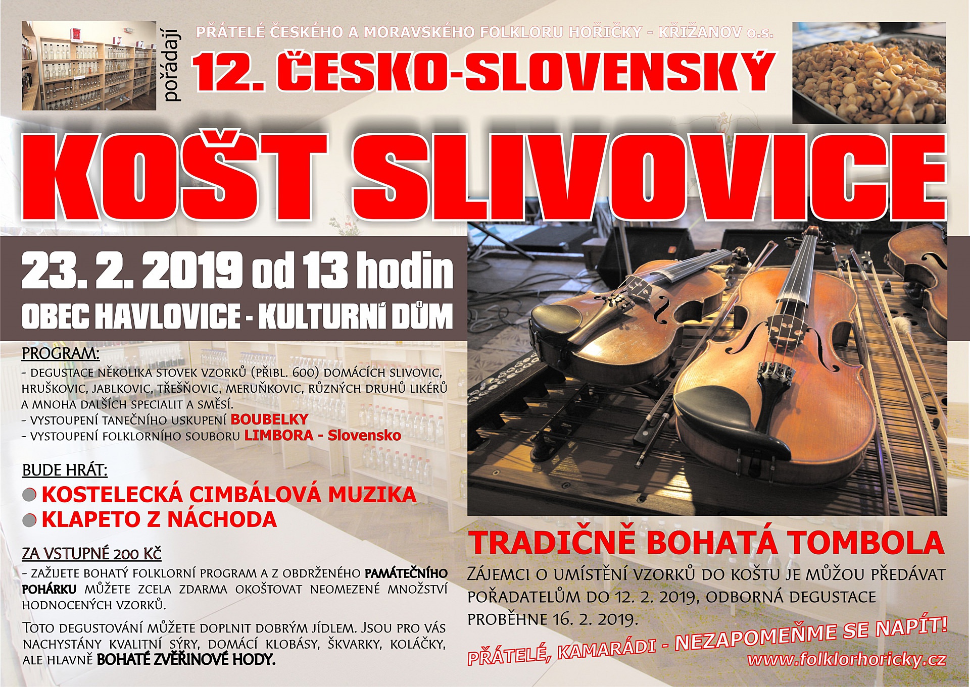 V sobotu 23. únoru 2019 od 13 hodin se koná v kulturním domě v Havlovicích 12. Česko-slovenský Košt slivovice. Je připravena degustace několika stovek vzorků (přibl. 600) domácích slivovic, hruškovic, jablkovic, třešňovic, meruňkovic, různých druhu likérů a dalších specialit. Hrát bude Kostelecká cimbálová muzika a Klapeto z Náchoda. Vystoupí taneční uskupení Boubelky a folklorní soubor Limbora. Vstupné na akci je 200 Kč. Více informací na plakátu.