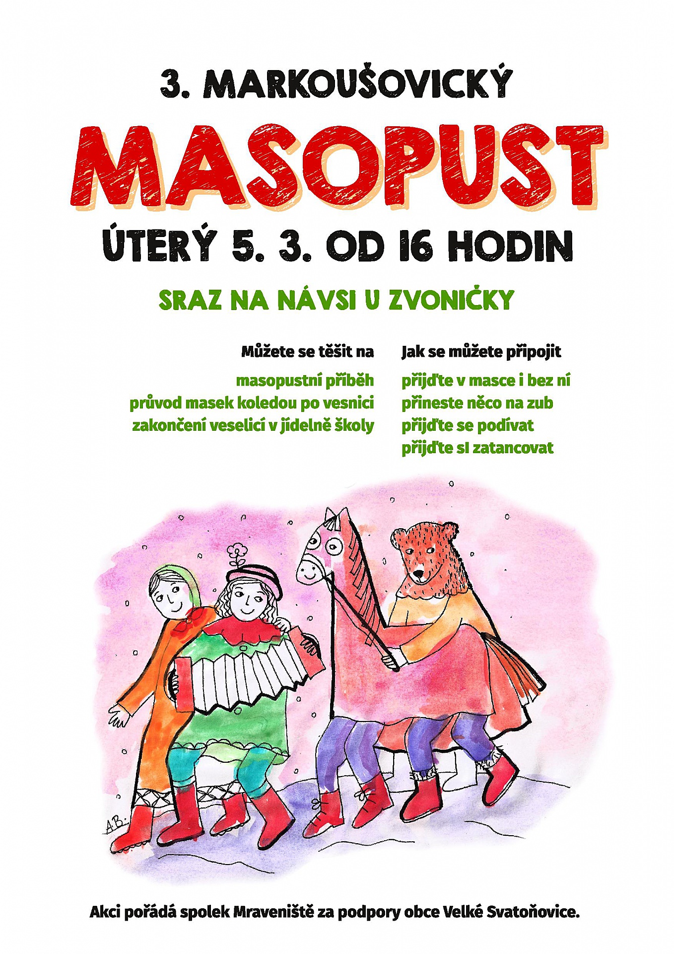 V úterý 5. března 2019 od 16 hodin je sraz na návsi u zvoničky v Markoušovicích v obci Velké Svatoňovice. Připraven je masopustní příběh a průvod masek s koledou po vesnici. Akce bude zakončená veselicí ve školní jídelně. Přijďte v masce, ale i bez ní. Také můžete donést něco dobrého na zub. Více informací na plakátu.