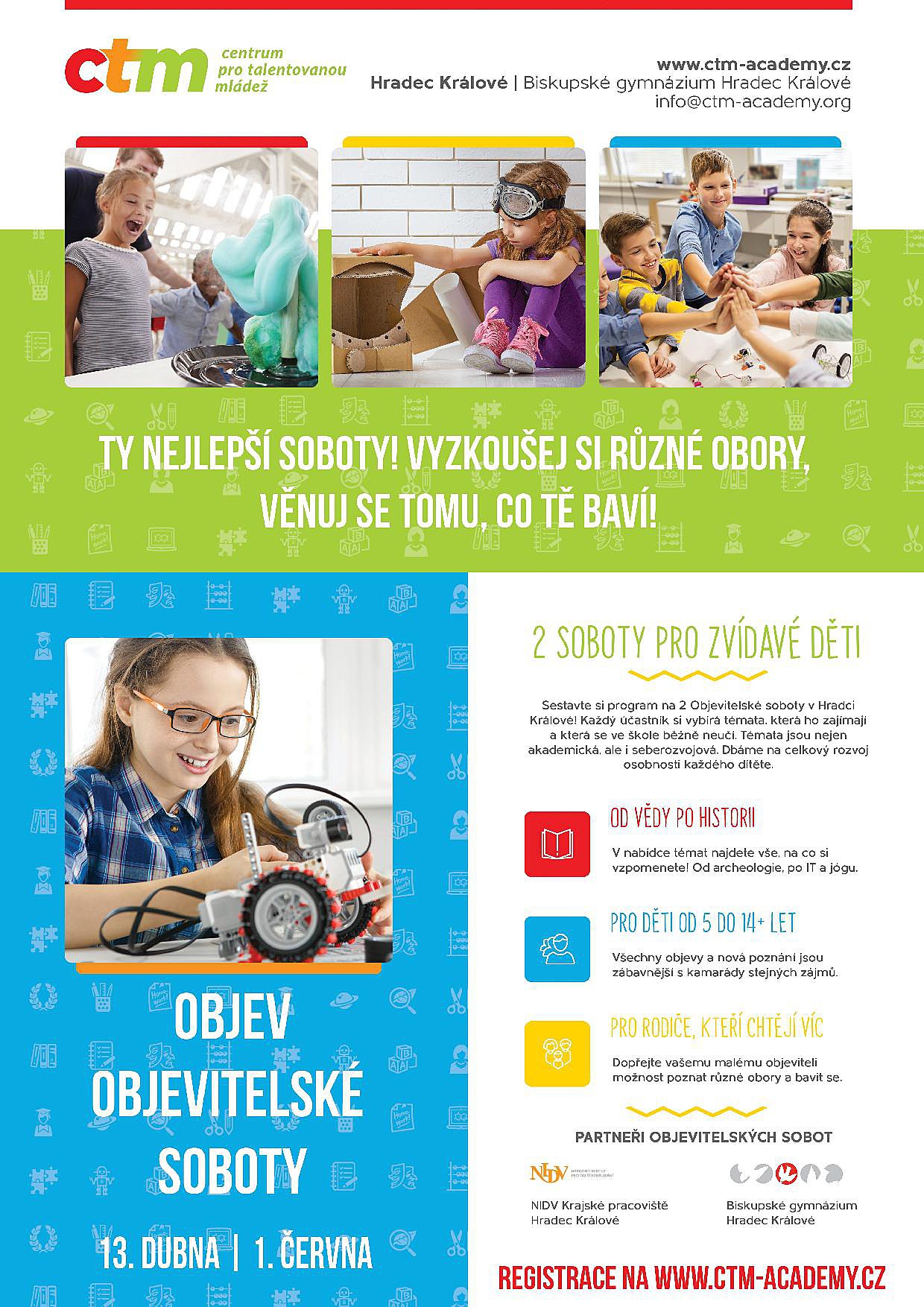 Díky spolupráci s Biskupským gymnáziem Bohuslava Balbína a NIDV Hradec Králové jsou naplánovány dvě pilotní Objevitelské soboty pro zvídavé děti ve věku 5 až 14+ let v Hradci Králové. Pod vedením zkušených lektorů si děti budou moct vyzkoušet tvoření, chemické pokusy, programování, modelování ve 3D, historicky badatelskou činnost a mnoho dalšího. Vybrané kurzy jsou pro děti připravené v angličtině. Pilotní Objevitelské soboty na zkoušku proběhnou 13. dubna a 1. června za cenu 250 Kč za lekci (1,5 hod). Na dubnovou sobotu je již možné se hlásit na webu: https://www.ctm-academy.cz/objevitelske-soboty. Více informací na plakátu.