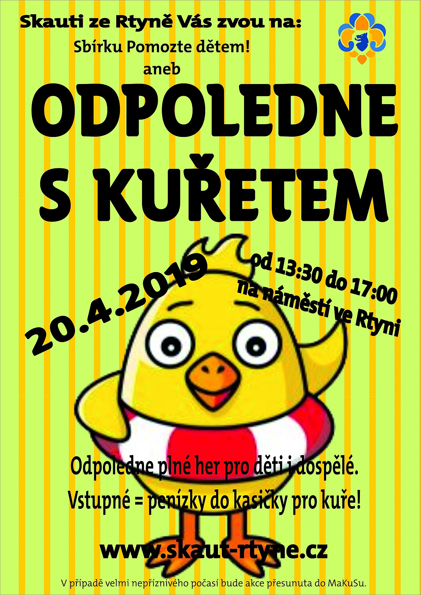 Skauti ze Rtyně vás zvou na Sbírku Pomozte dětem! aneb Odpoledne s kuřetem, které se uskuteční v sobotu 20. dubna 2019 od 13:30 do 17:00 hodin na náměstí ve Rtyni v Podkrkonoší. Čeká vás odpoledne plné her pro děti i dospělé. Vstupné = peníze do kasičky pro kuře. Více na plakátu a www.skauti-rtyne.cz.