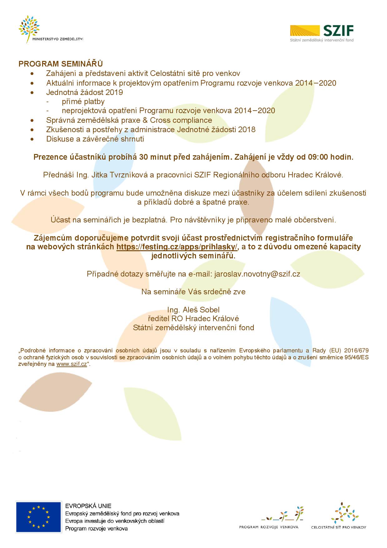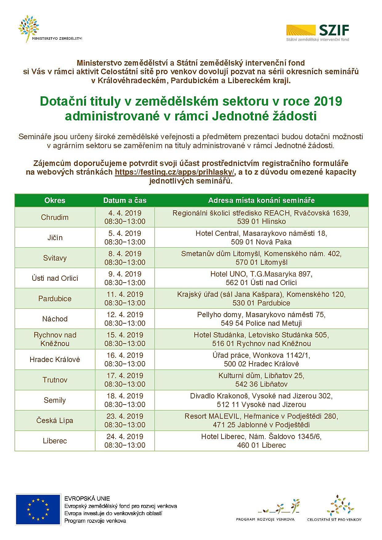 Dovoluji si Vás pozvat na sérii okresních seminářů k dotačním možnostem v agrárním sektoru se zaměřením na tituly administrované v rámci Jednotné žádosti v roce 2019.