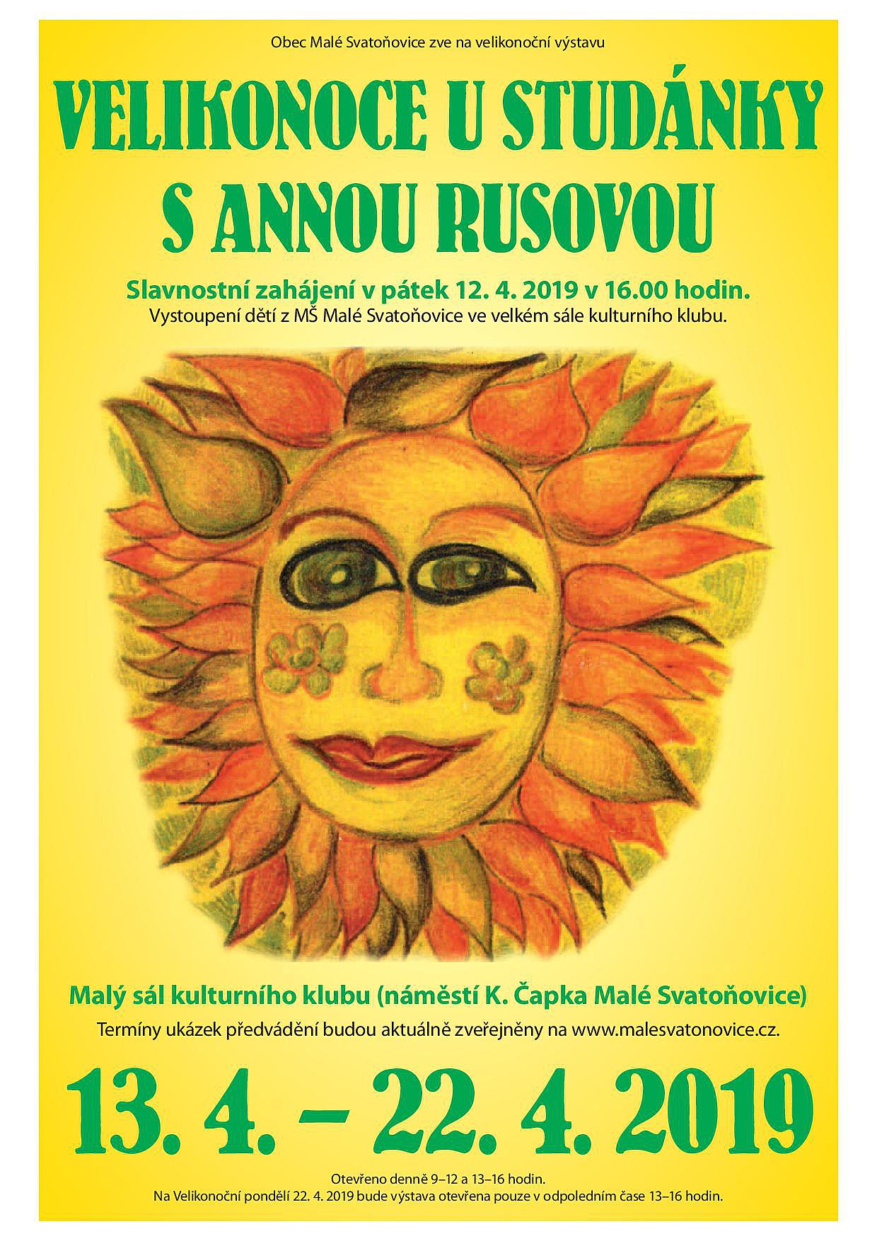 Od 13. 4. do 22. 4. 2019, malý sál kulturního klubu v Malých Svatoňovicích. Vstupné: děti 10 Kč (do 6 let zdarma), ostatní 20 Kč.