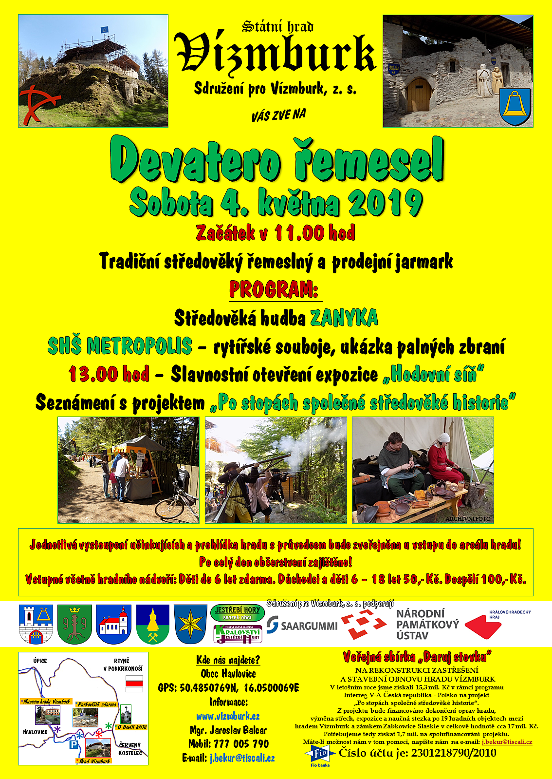 Sdružení pro Vízmburk zahajuje Vízmburské kulturní léto tradičním středověkým a prodejním jarmarkem Devatero řemesel. Akce se uskuteční v sobotu 4. května 2019 od 11:00 hodin. Je připraven bohatý doprovodný program a hradní občerstvení po celý den. Více informací na plakátu.