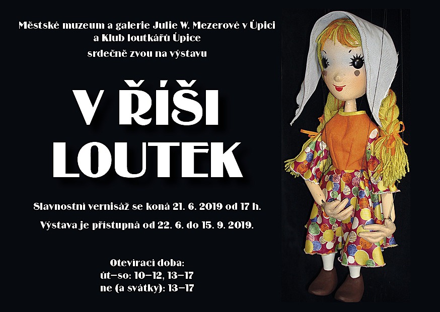 Městské muzeum a galerie Julie W. Mezerové a Klub loutkářů Úpice srdečně zvou na vernisáž velké letní výstavy věnované historii i současnosti českého a hlavně úpického loutkářství, činnosti Klubu loutkářů Úpice a především světu pohádek a fantazie.