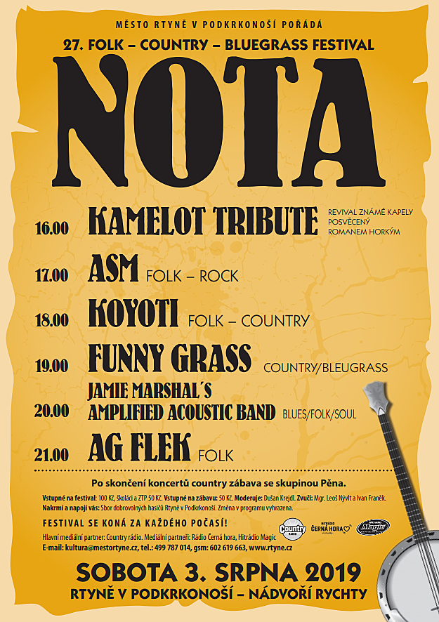 Srdečně Vás zveme na 27. ročník country - bluegrass - folkového festivalu NOTA 2019, který se uskuteční v sobotu 3. 8. 2019 na nádvoří staré Rychty ve Rtyni v Podkrkonoší.