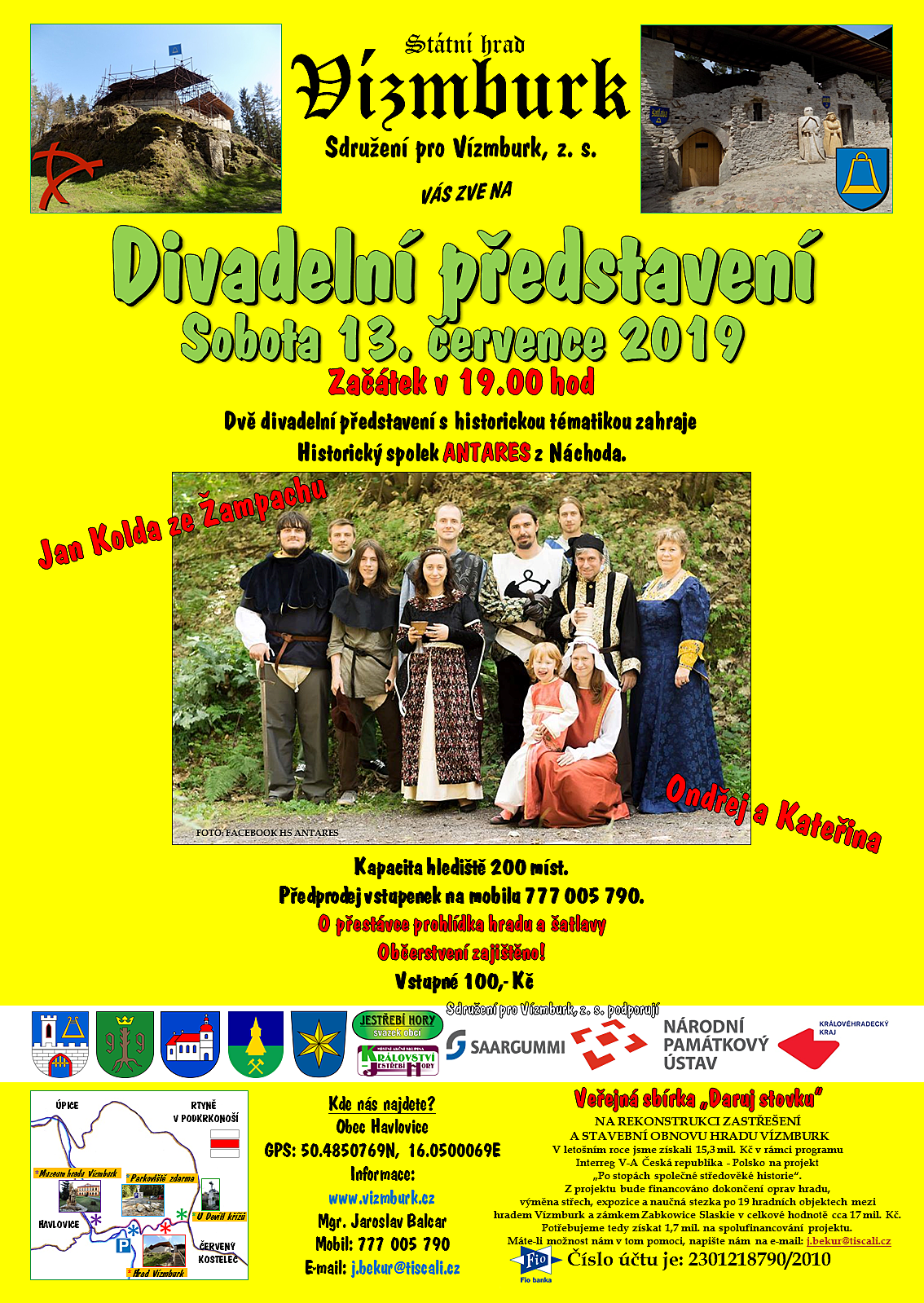 V sobotu 13. 7. 2019 se uskuteční divadelní dvojpředstavení s historickou tematikou. Na hradě bude účinkovat historický spolek Antares z Náchoda. Vstupenky jsou již nyní v předprodeji na telefonu 777005790 k osobnímu odběru - buď na hradě nebo u J. Balcara. Více informací na plakátku.
