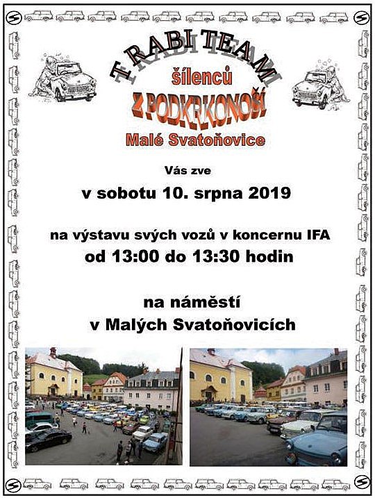 Zveme Vás na výstavu vozů koncernu IFA na náměstí do Malých Svatoňovic v sobotu 10. srpna 2019 od 13:00 do 13:30 hodin.